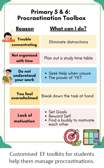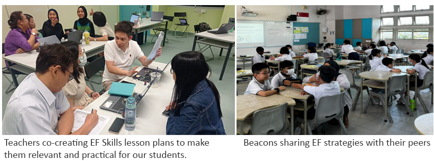 Executive Function (EF) refers to a set of skills that are essential for learners to develop the capacity to plan ahead and meet goals, display self-control, follow multi-step directions and stay focused despite distractions. This forms a foundation for self-regulation to help children build social-emotional skills and prepare them for learning. Beacon customises and designs lessons to build EF skills in a progressive manner. Classroom practices and school routines are platforms for students to practise these EF skills daily to ensure consistency.