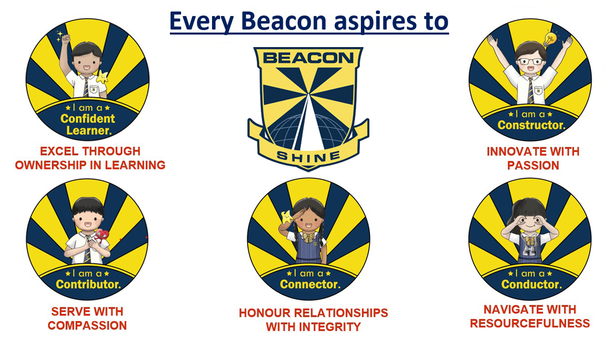 Beacon’s SHINE values drive all character development programmes. The school explicitly aligned the SHINE values to the Character and Citizenship Education (CCE) learning outcomes and emphasised on having a common language when delivering CCE curriculum content and experiences. Every Beacon aspires to be a Contributor, Connector, Constructor, Conductor and a Confident Learner. Through the SHINE values lessons, students and teachers explore, reflect and practice on how to be a SHINE-ing Beacon in our daily activities and actions.