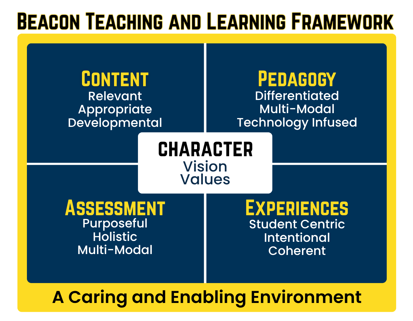 Our main focus is to achieve the school’s Vision and Values. We believe in developing the Character of our students as the strong foundation for success. To achieve this, teachers give attention to the Content, Pedagogy, Assessment and Experiences that we carefully craft for our students.